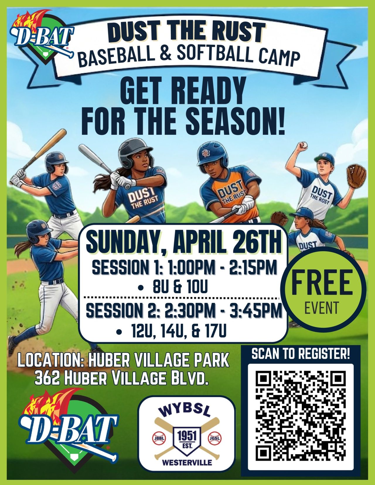 Join us for the FREE Dust the Rust Baseball & Softball Camp on Sunday, April 26th at Huber Village Park (362 Huber Village Blvd).