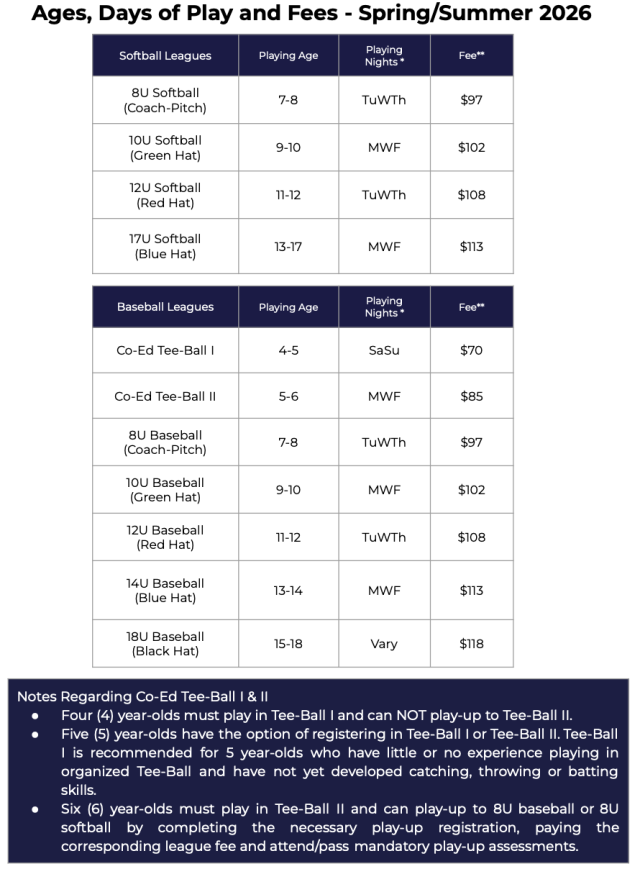 TEE-BALL, 8U SOFTBALL & 17U SOFTBALL ONLY. In order to be put on a team with one friend or be paired with another coach, both players must request each other on their registration forms. We will not necessarily honor requests for more than one person who lists the same friend and will not allow “chaining”, where one player lists one friend who lists another friend and so on. Lastly, requests must be made by the regular registration deadline to be guaranteed.