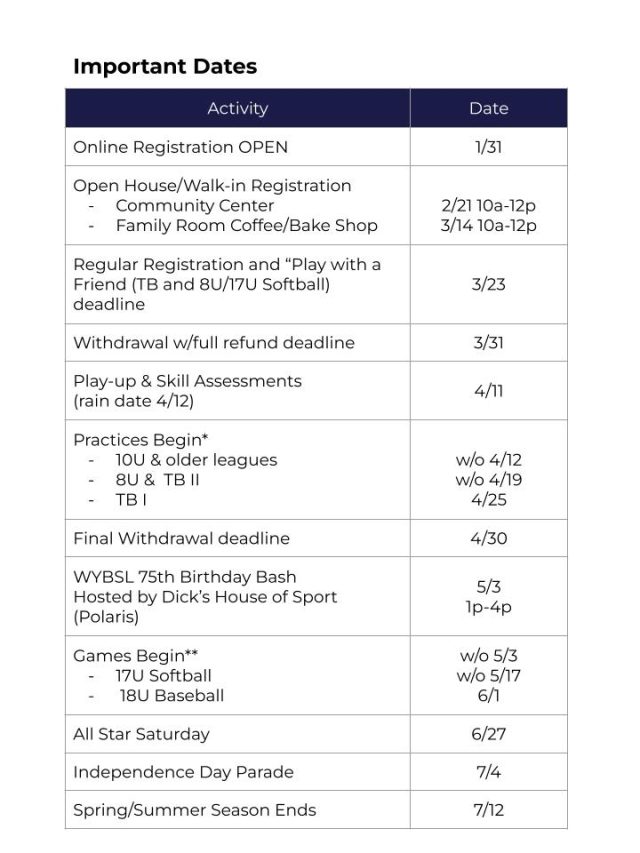 ** Each player must add a $24 Fields Fund Fee to the above amount. This is WYBSL’s only Player Fund Raiser during the season. ALL PROCEEDS GO TO OUR FIELDS FUND TO MAINTAIN, RENOVATE AND/OR BUILD NEW FACILITIES.